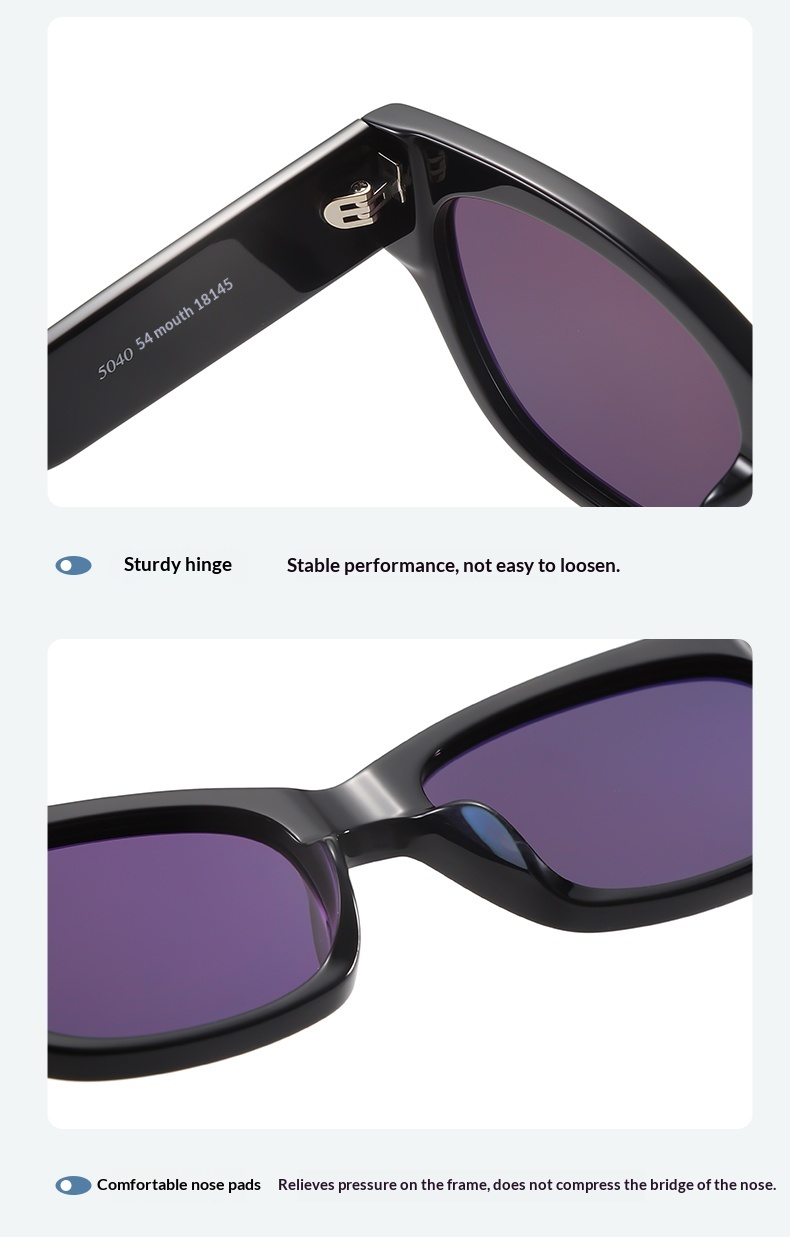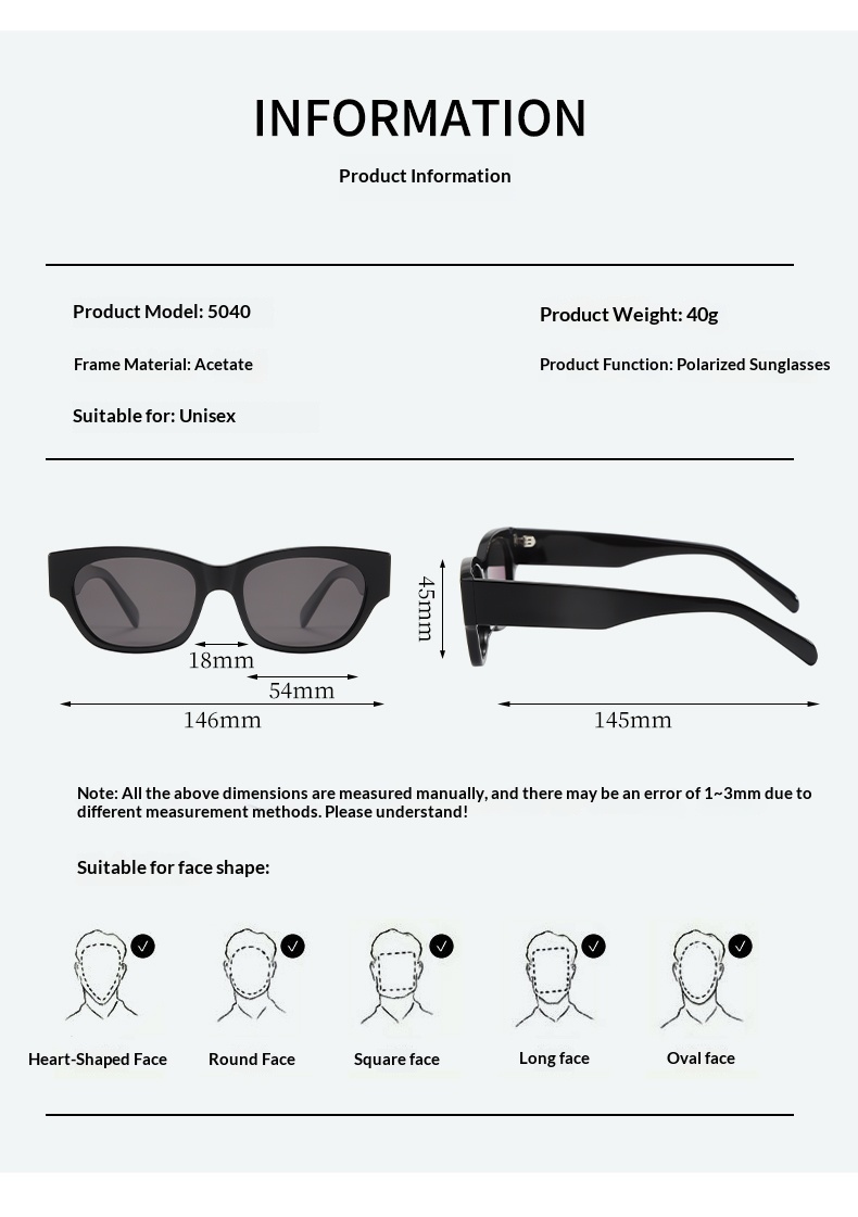 Original Italian acetate fiber sheet frame+American Polaroid high-definition polarized nylon lenses, lens width: 54mm, lens height: 45mm, nose distance: 18mm, temple length: 145mm, total width of glasses: 146mm